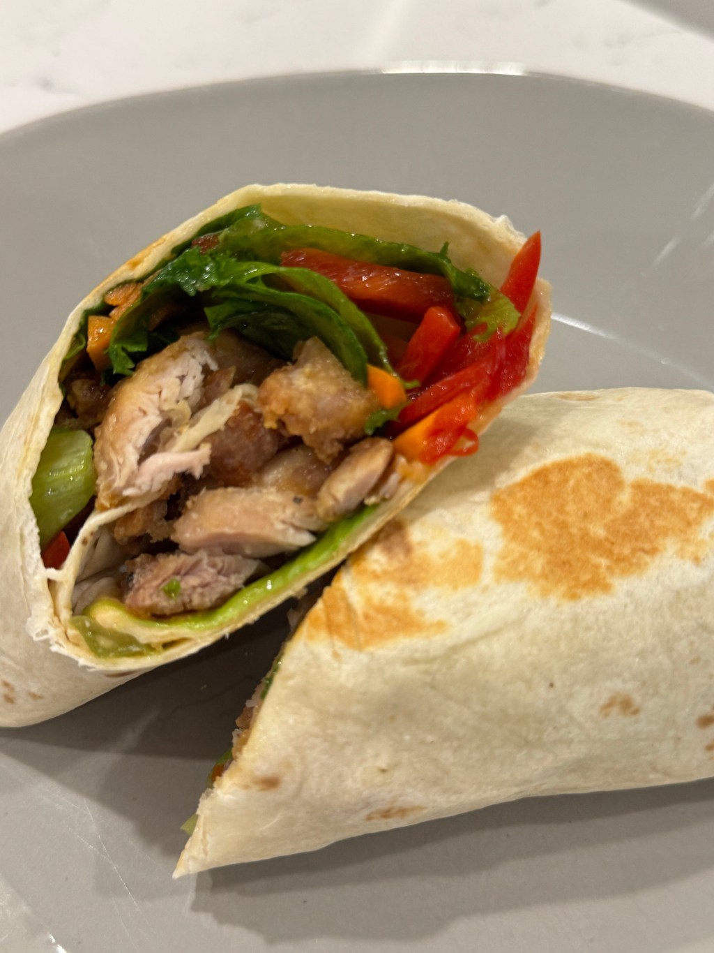The chicken gets ultra-crispy thanks to a simple cornstarch coating and high-heat finish in the air fryer. Tossed with a crisp veggie salad and wrapped up burrito-style, it’s a balanced, light, and super satisfying meal.